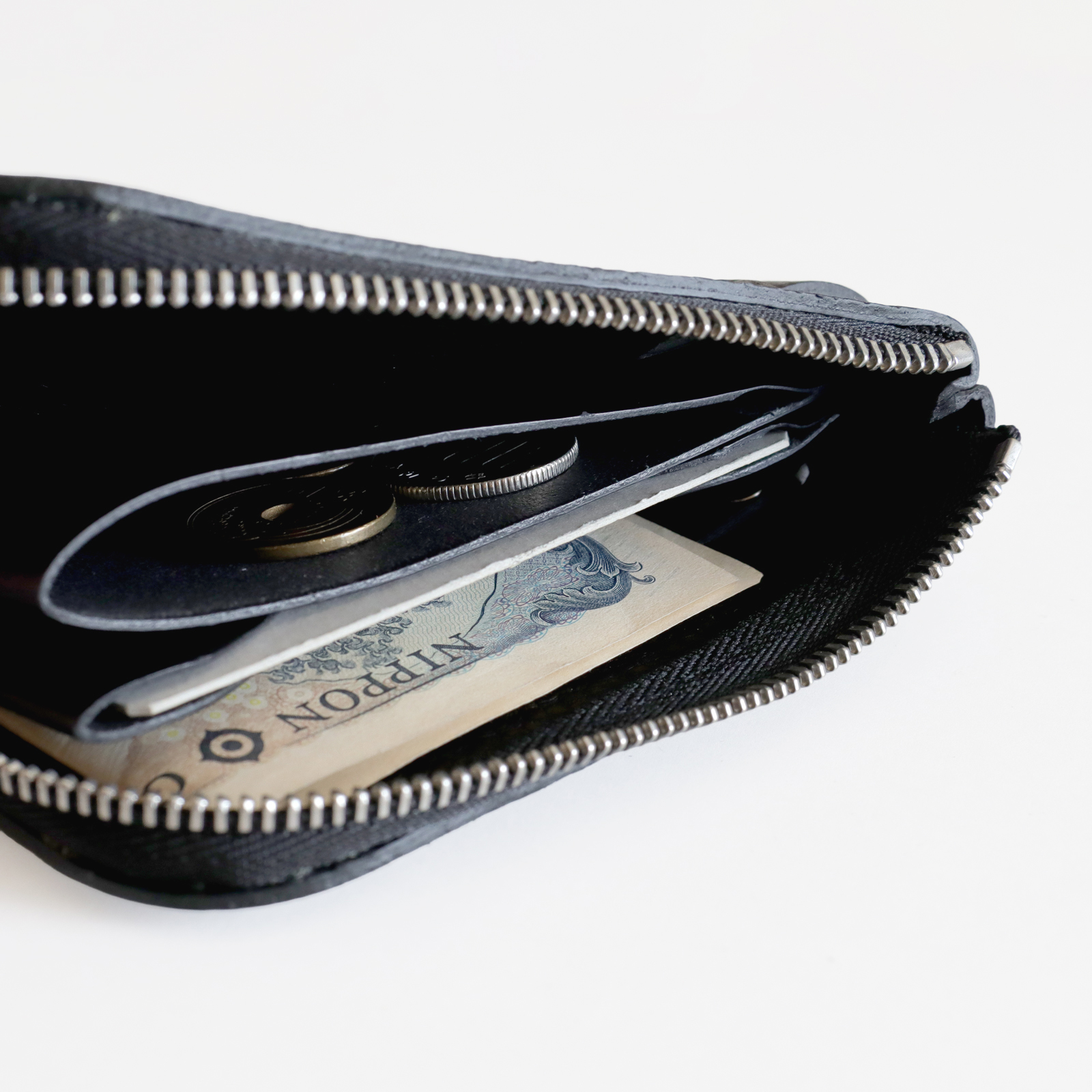 少ない所作で会計をすませることができるL字ファスナーのミニ財布です。