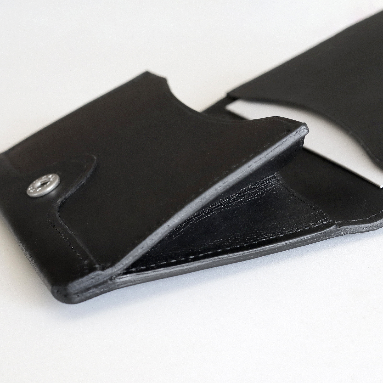 両側の折り込んだマチが、すっきりとした印象と平らなフォルムを形づくり、鞄やポケットに収まりやすくしています。